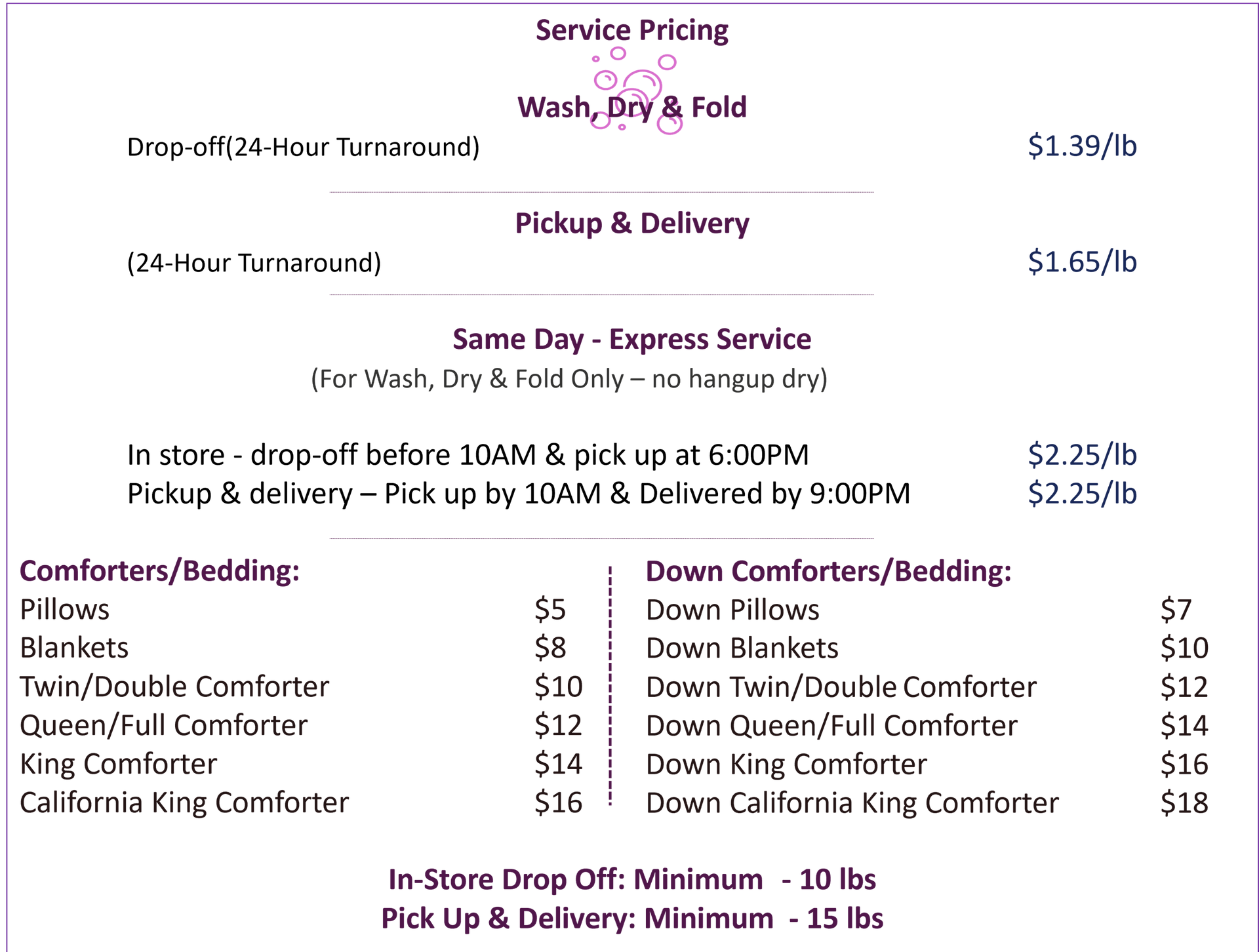 Leave your laundry with us, and we’ll handle everything - sorting, washing, drying, folding, and packaging. All you have to do is pick it up, fresh and ready to go.